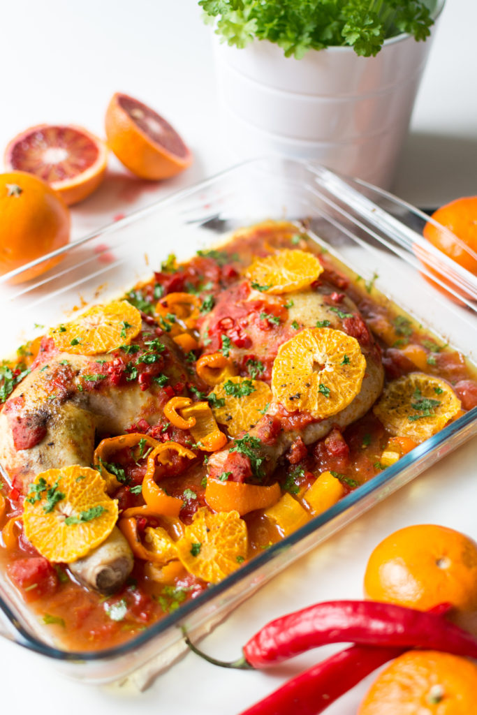 2- Sortir les cuisses de poulet, les déposer dans un plat allant au four. Déposer les tomates concassées, le poivron préalablement coupé en morceaux et les tranches d’orange sanguine.