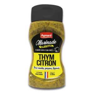 Prête à l’emploi, la marinade Thym Citron Aymard est proposée en pot de 170g refermable.