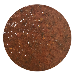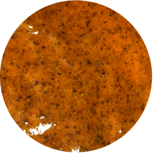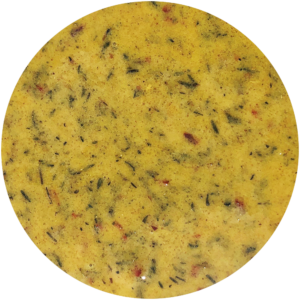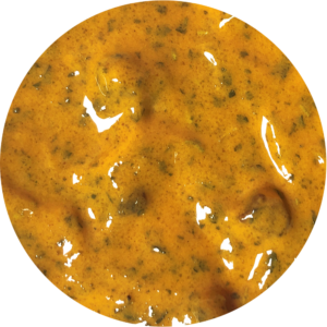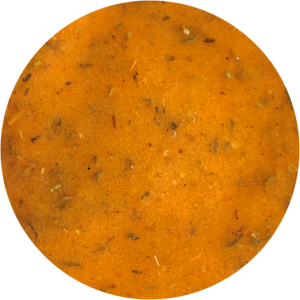 Enrobage orange avec quelques marquants d’herbes aromatiques et de poivrons.